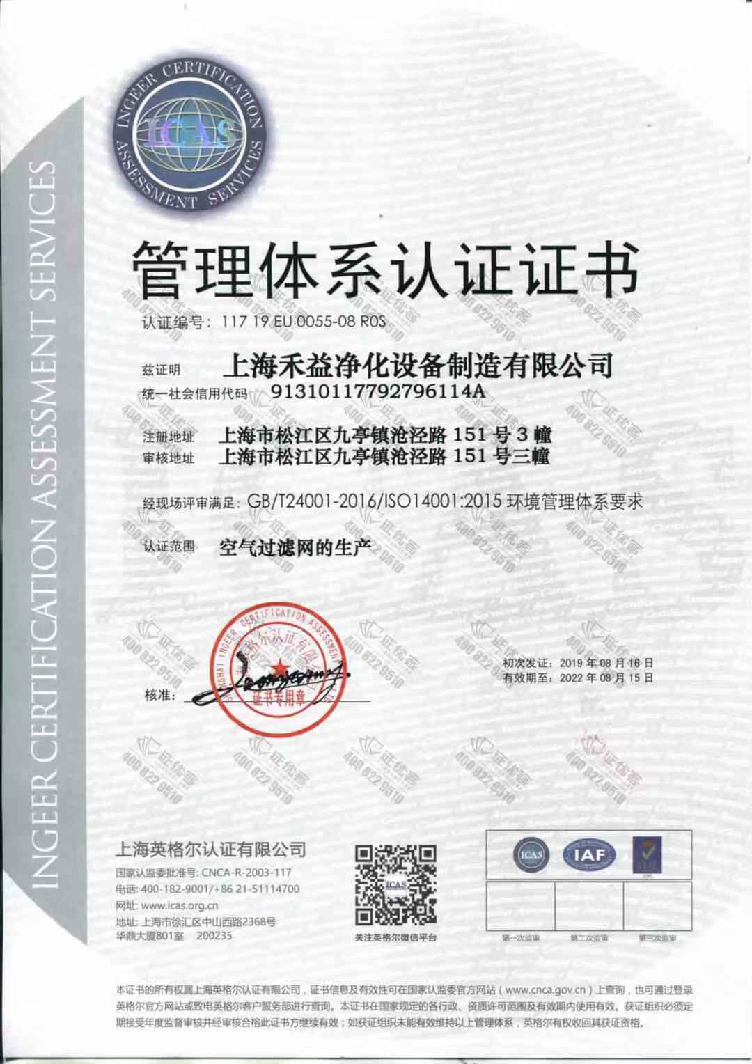 - 熱烈祝賀上海禾益凈化順利獲得(ISO14001)環境管理體系認證2019-08-26 16:20:54