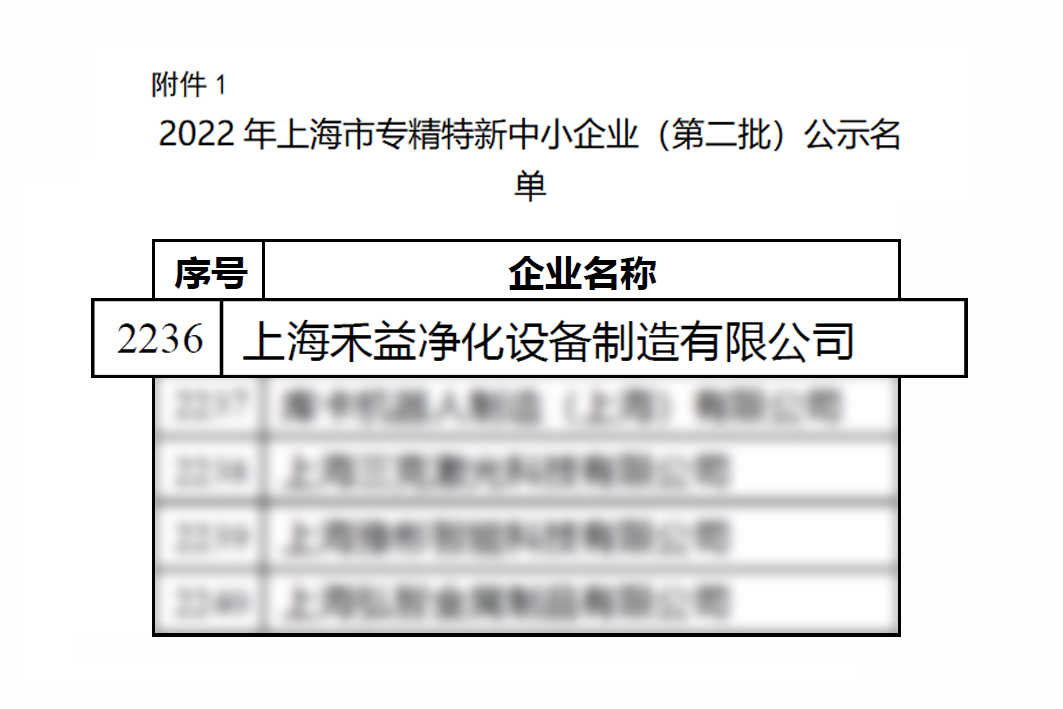 近日,上海市經(jīng)濟(jì)和信息化委員會(huì)公示2022年上海市“專精特新”企業(yè)名單(第二批),經(jīng)過(guò)專家評(píng)審與綜合評(píng)估,上海禾益凈化設(shè)備制造有限公司(簡(jiǎn)稱:禾益環(huán)境)獲評(píng)“上海市專精特新中小企業(yè)”稱號(hào)!